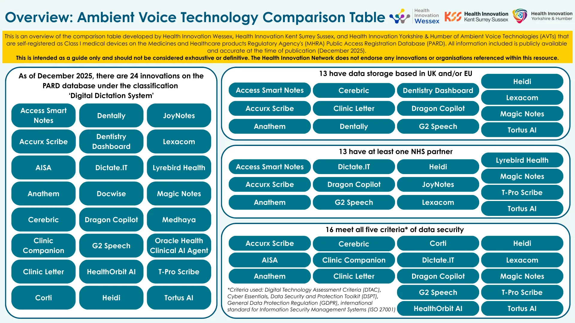 News New resource – Ambient Voice Technology comparison table 16 December 2025 Share Share on Linkedin Share on X Share via email News Digital, Data & AIMedTech Funding Mandate Health and care professionalsInnovator hubLife sciences and industry A collaborative of Health Innovation Networks has produced a comparison table to help health and care providers choose an Ambient Voice Technology (AVT) provider that suits their needs. Compiled as a joint initiative between Health Innovation Kent Surrey Sussex, Health Innovation Wessex, and Health Innovation Yorkshire & Humber, it was created in response to requests from people working in health and social care asking which ambient scribe they should use. As a Health Innovation Network, we cannot recommend any one provider, but we can help by showing what is available and where we have carried out independent evaluations. The information grid lists ambient scribes registered with the MHRA as Class 1 medical devices. For each scribe, it details – Company information Evaluation and data security information Examples of where it is already used, integration and partnerships Cost models It is not a definitive list. More providers are constantly registering with the MHRA, as this is a fast-paced, growing market. We will update the grid regularly. To keep up to date with AVT news from our team, sign up to our AVT Alerts mailing list. View the table In separate but related news, NHSE is set to launch a self-certified registry for the use of AI-enabled ambient scribing products in health and care settings. It has not shared a publication date, but it is expected in December 2025.